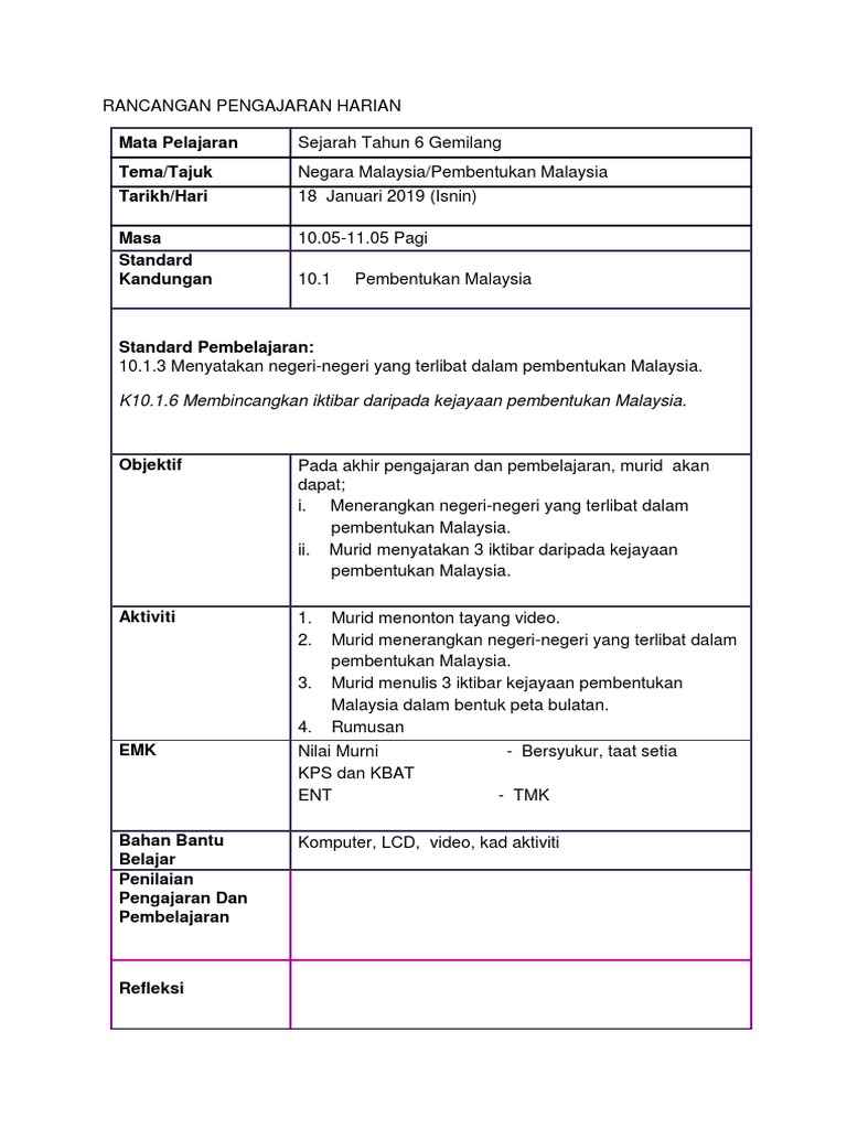 Mata Pelajaran Tema Tajuk Tarikh Hari Masa Standard Kandungan