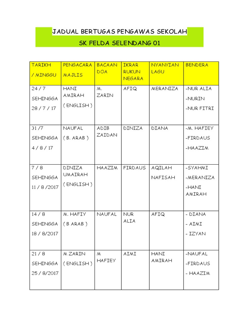 Jadual Bertugas Pelajar 3a5 2018 Monday