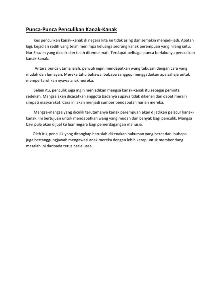 Punca Berlakunya Penculikan Kanak Kanak By Masyitah Omar