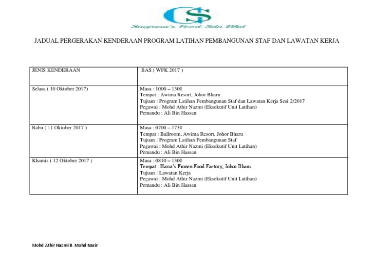 Jadual Pergerakan Kenderaan Program Latihan Pembangunan Staf Dan Lawatan Kerja