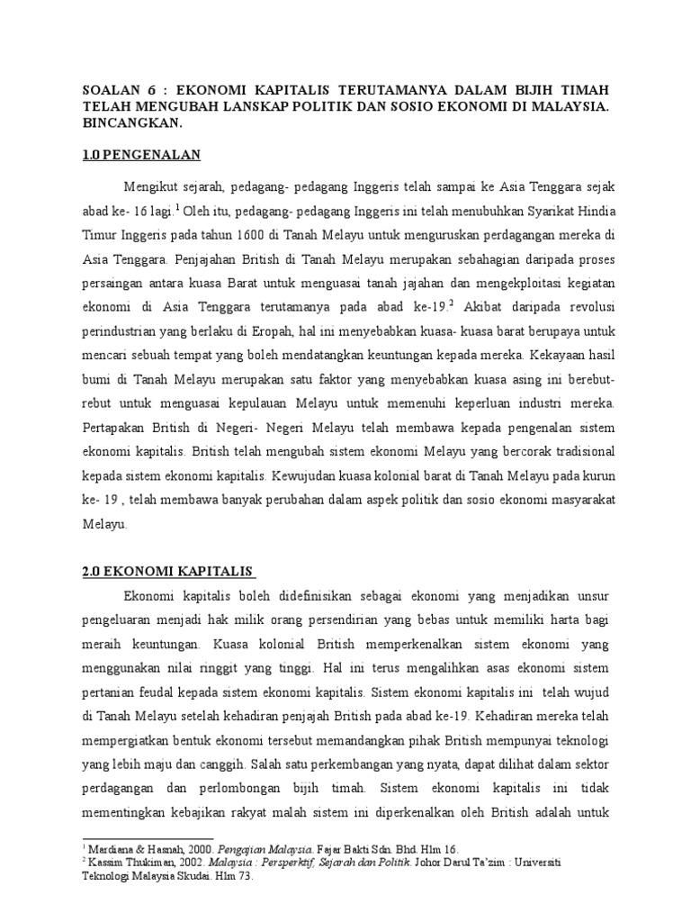 Pdf Soalan 6 Ekonomi Kapitalis Terutamanya Dalam Bijih Timah Telah Mengubah Lanskap Politik Dan Sosio Ekonomi Di Malaysia Bincangkan Hasbullah Salleh Academia Edu