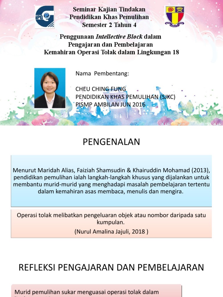 Seminar Kajian Tindakan Pendidikan Khas Pemulihan Semester 2 Tahun 4 Penggunaan Intellective Block Dalam Pengajaran Dan Pembelajaran Kemahiran Operasi Tolak Dalam Lingkungan 18