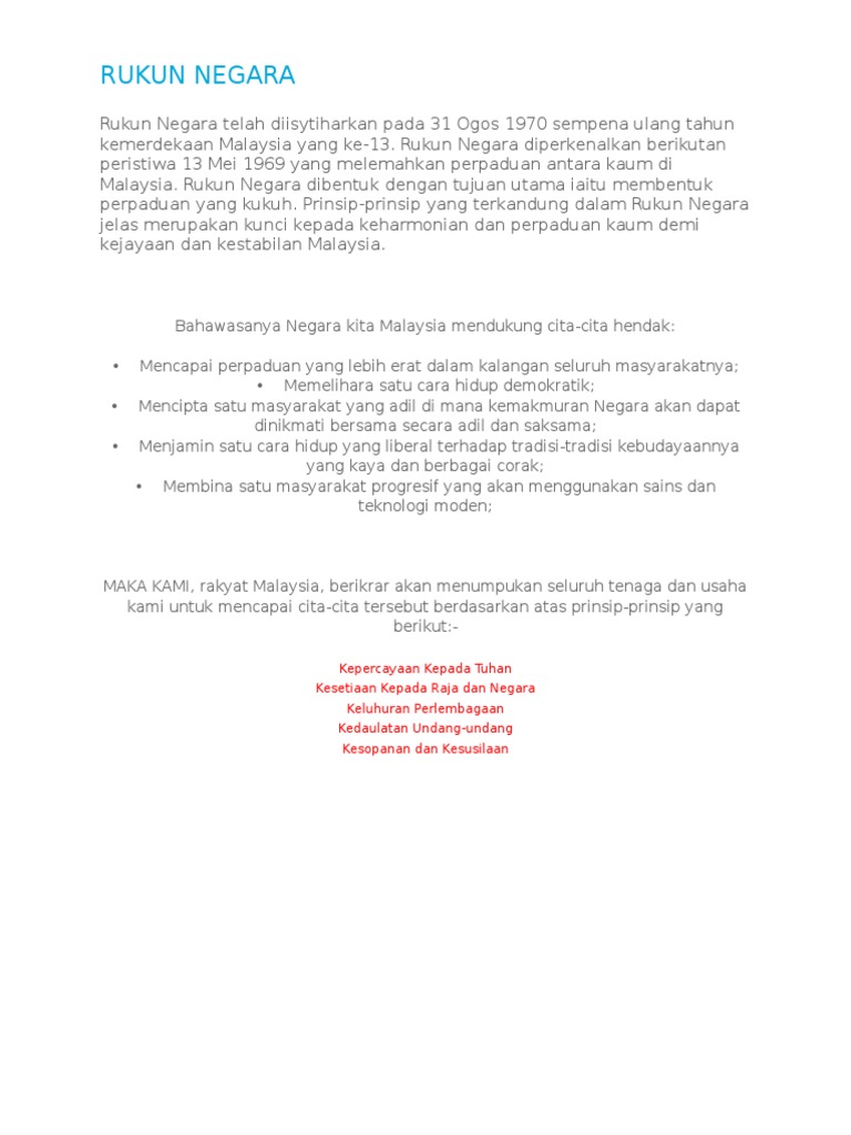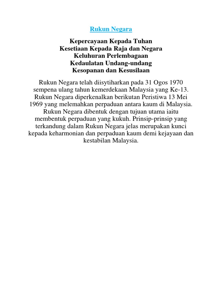 Rukun Negara Kepercayaan Kepada Tuhan Kesetiaan Kepada Raja Dan Negara Keluhuran Perlembagaan Kedaulatan Undang Undang Kesopanan Dan Kesusilaan Pdf Download Gratis