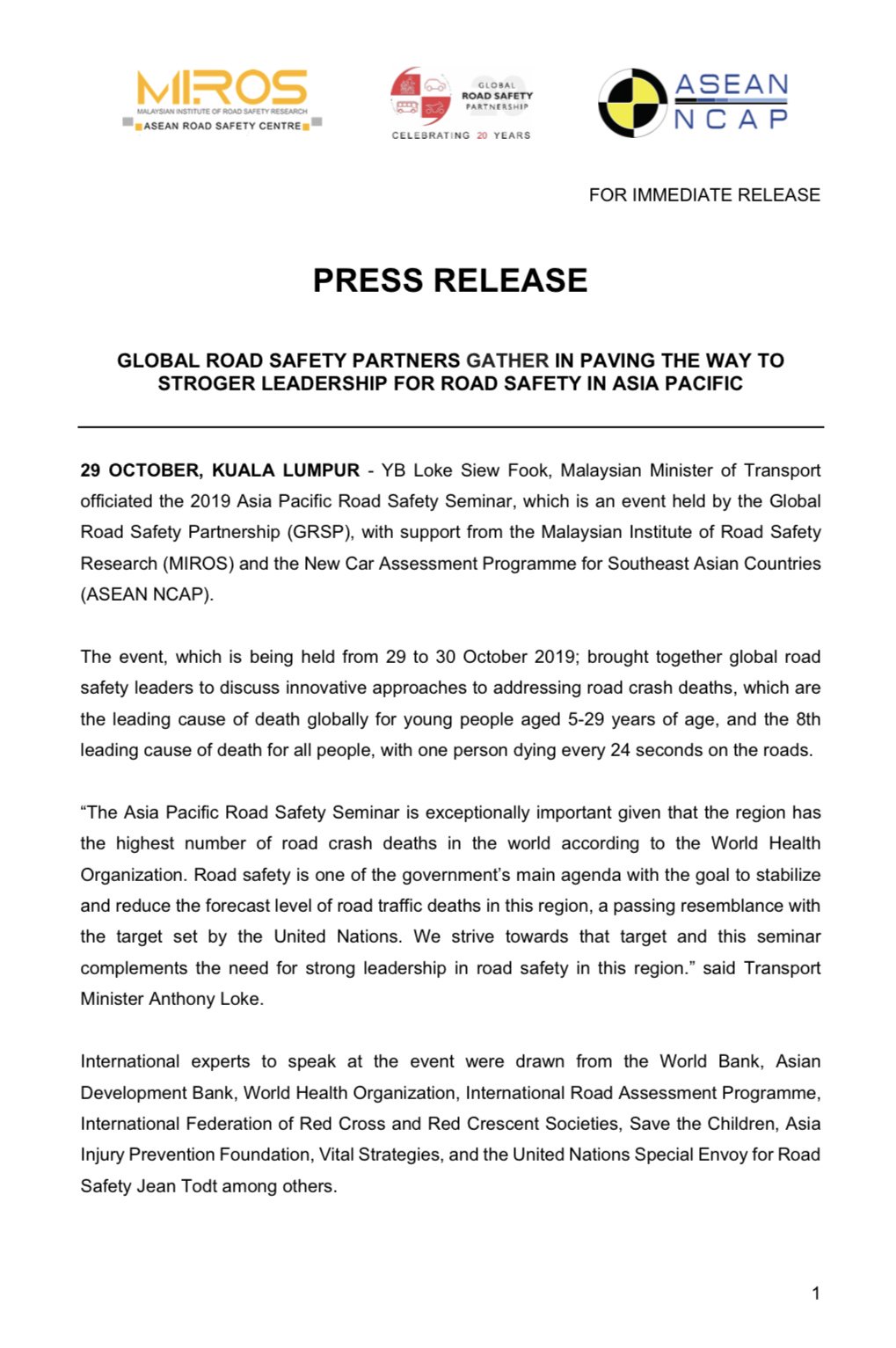 Miros On Twitter Roadsafetyapac 29 October 2019 It S A Wrap For Day 1 At 2019 Asia Pacific Road Safety Seminar Press Release Global Road Safety Partners Gather In Paving The Way To