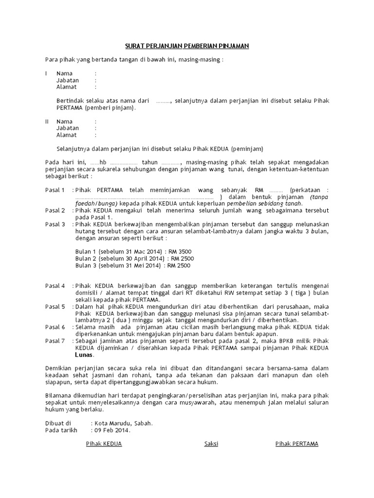 Pemberi Pinjam Hutang Contoh Surat Perjanjian Pinjaman Wang