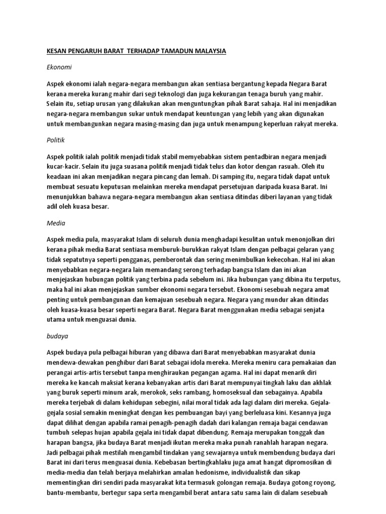 Barat sesuai namanya merupakan produk perkembangan di bilangan barat dunia yang menekankan individualitas dan kebebasan. Kertas yang telah sekian lama digunakan di timur tengah dan di barat mengambil alih peranan yang dimainkan oleh batu logam daun lontar. Pengaruh budaya barat merupakan gerakan pembaratan dan penjajahan fikiran yang dilancarkan kepada sesebuah negara yang mempunyai tujuan yang nyata iaitu menundukkan negara itu kepada kuasa imperliasnya dengan meleburkan nilai nilai murni memesongkan pengertian agama dan memusnahkan asas tunjang yang menjadi amalan pembentukan seseorang. Kesan pengaruh barat terhadap tamadun malaysia ekonomi aspek ekonomi ialah negara negara membangun akan sentiasa bergantung.