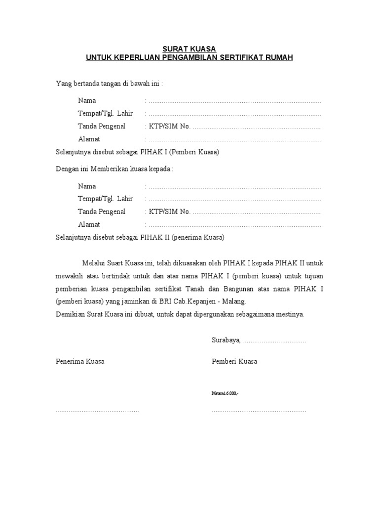 Perwakilan Pengambilan Sertifikat Perwakilan Contoh Surat Kuasa
