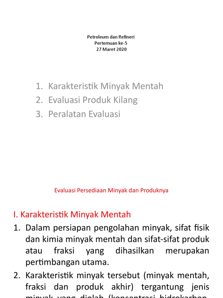 1 Karakteristik Minyak Mentah 2 Evaluasi Produk Kilang 3 Peralatan Evaluasi