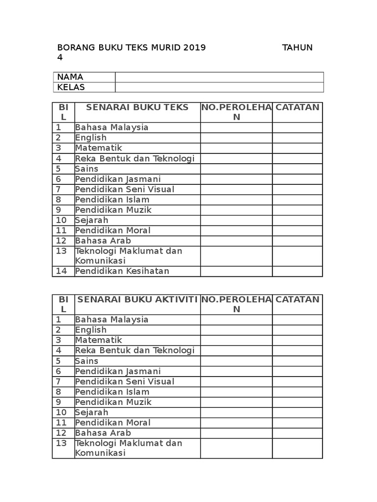 Borang Buku Teks Murid 2019 Tahun 4 Nama Kelas Bi L Senarai Buku Teks No Peroleha N Catatan