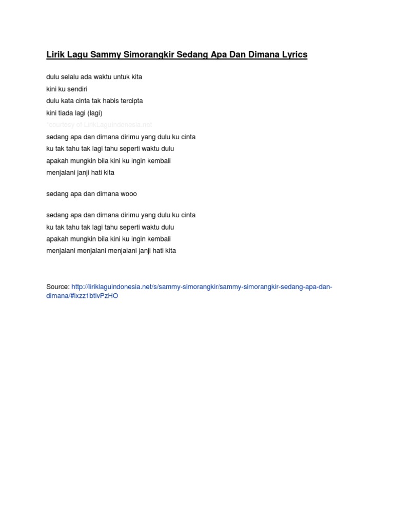 Sedang apa dan dimana dirimu yang dulu kucinta. Sammy simorangkir sedang apa dan dimana sammy simorangkir 1 858x dilihat 7 bulan yang lalu download lagu sammy simorangkir sedang apa dan dimana ukuran 3 63 mb durasi 03 55 menit dengan kualitas audio mp3 terbaik hd video mp4 dan lirik diupload oleh pro m. Ah yasudahlah mungkin itu hanya kebetulan saja. Lirik sedang apa dan dimana dari sammy simorangkir ini dipublikasikan pada tanggal 16 agustus 2011 9 tahun yang lalu lagu ini ada di dalam album aku kembali yang didistribusikan oleh label pro music. Interlude c bm c em d c bm f d e chorus overtone d sedang apa f d sedang apa dan di mana.