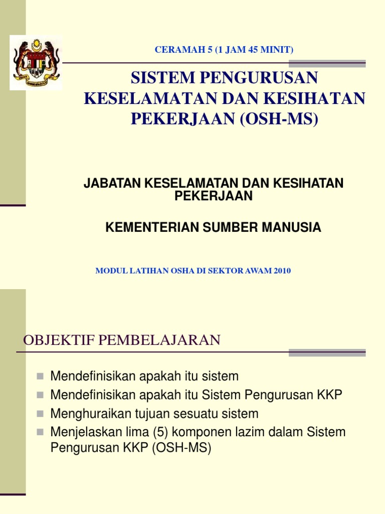 Sistem Pengurusan Keselamatan Dan Kesihatan Pekerjaan Osh Kkp Osh Ms 1 Dasar 2 Rancang Perancangan Sistem Objektif Kkp Pembangunan Dan Perlaksanaan 3 Laksana Tugasan Dan