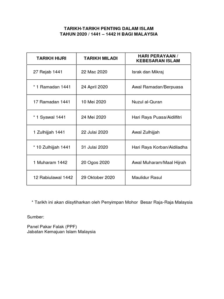 Tarikh Tarikh Penting Dalam Islam 2020 Latest