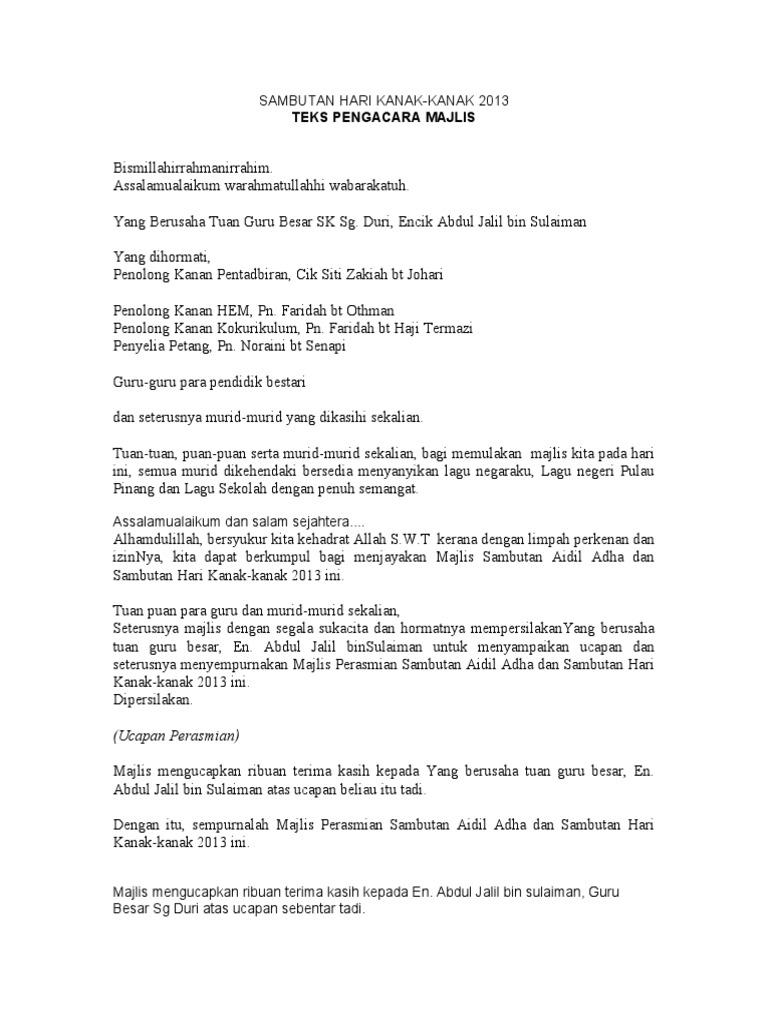 Sambutan Hari Kanak Kanak 2013 Teks Pengacara Majlis