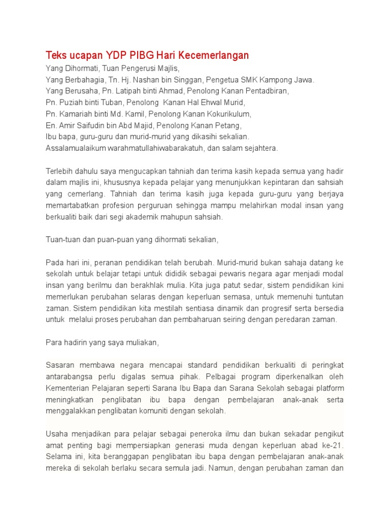 Teks Ucapan Ydp Pibg Hari Kecemerlangan