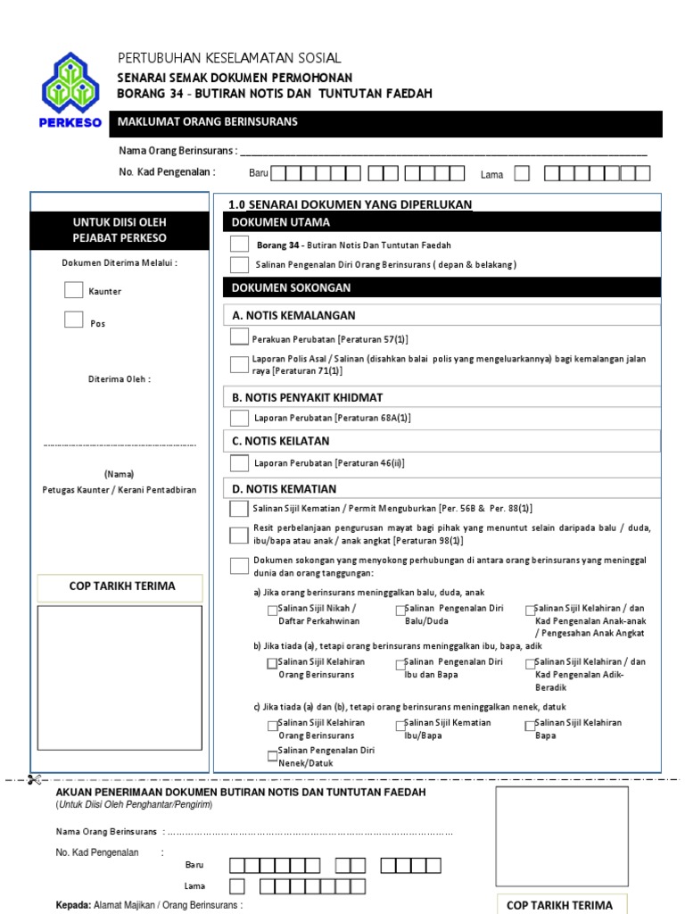 Borang 34 Butiran Notis Dan Tuntutan Faedah Alamat Surat Menyurat Poskod Negeri No Kad Pengenalan Baru No Pasport No Polis No Tentera No Keselamatan Sosial Ssn No Kad Pengenalan