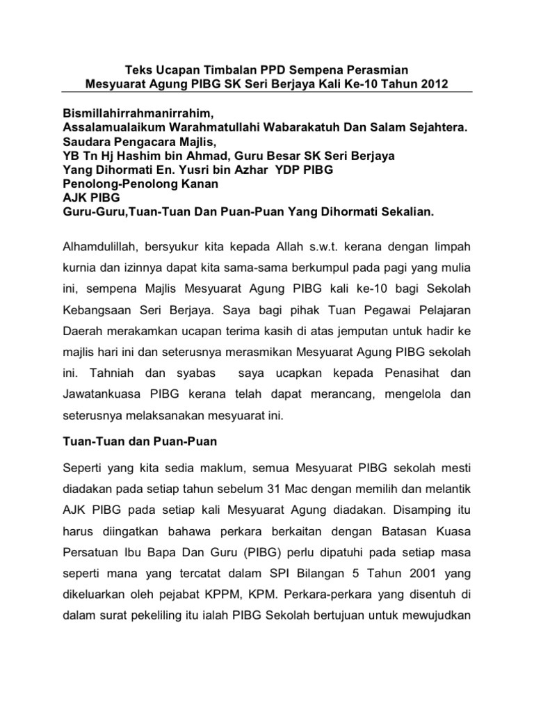 Teks Ucapan Guru Besar Sempena Mesyuarat Pibg Docx Document